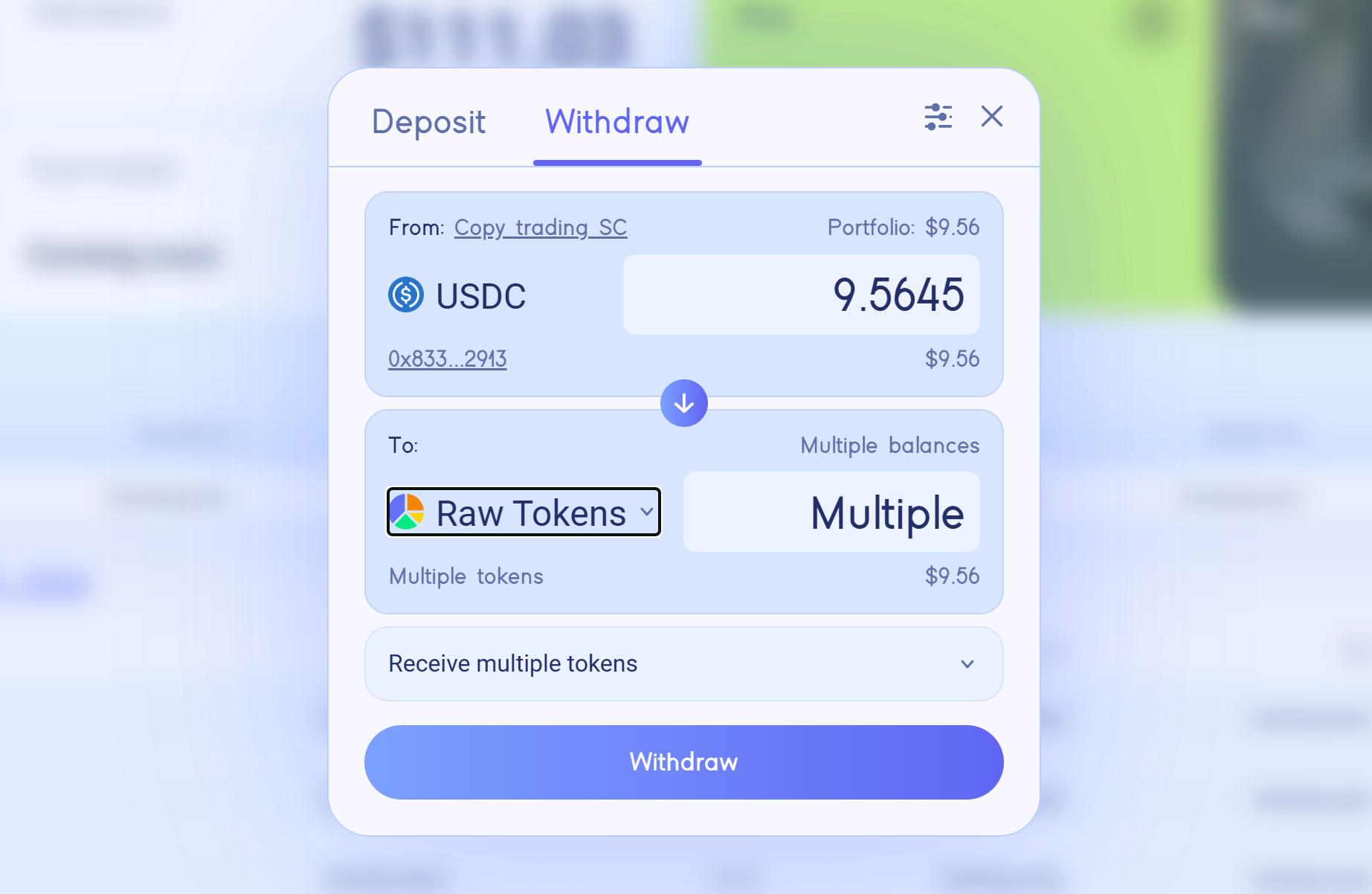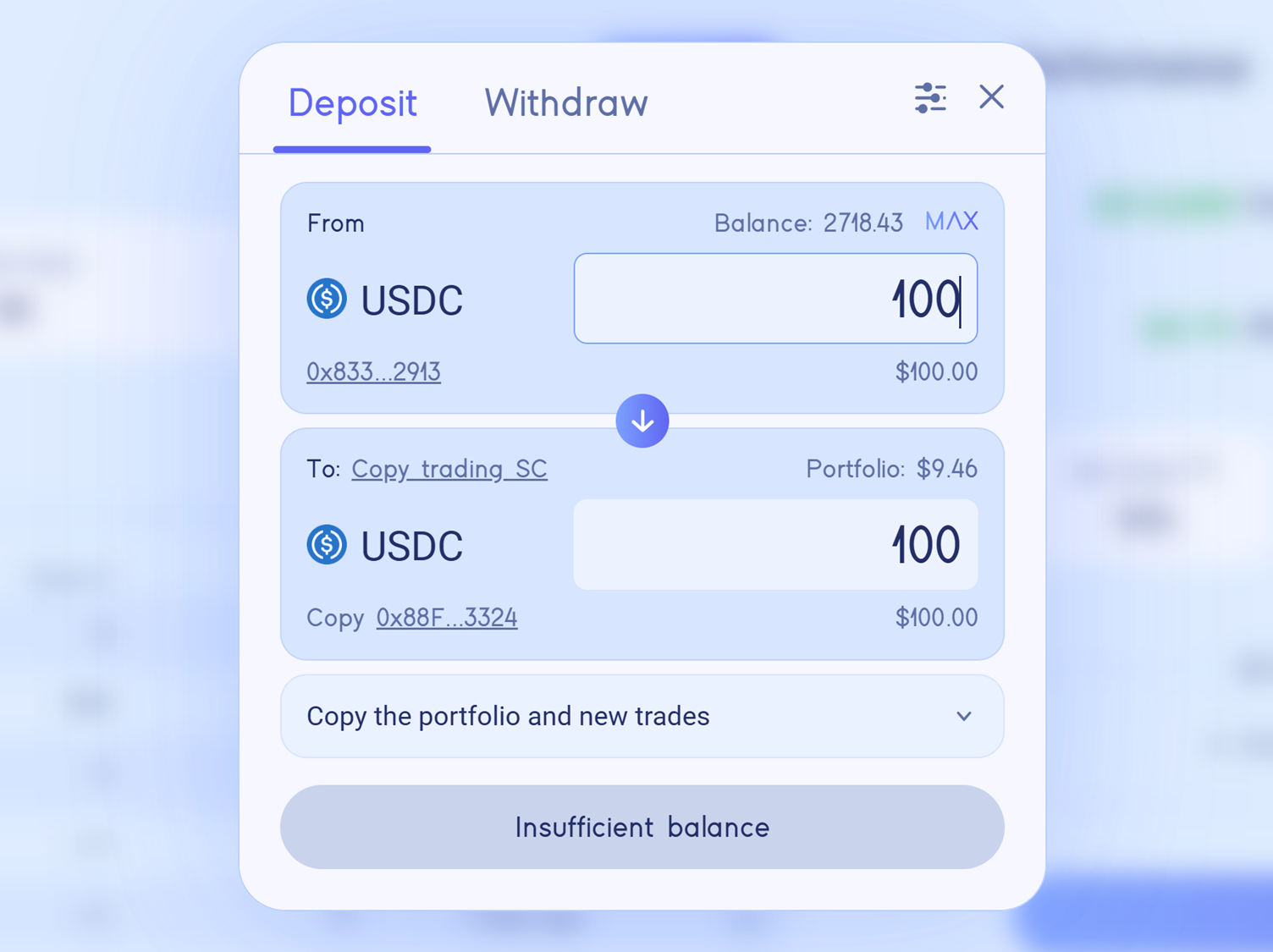 3. Once you selected a wallet to copy-trade deposit USDC on Base chain into the WOWMAX smart contract. The smart contract copies the entire coin portfolio of the selected wallet. Every buy or sell made by the wallet is instantly copied, with trades executed in the next block.