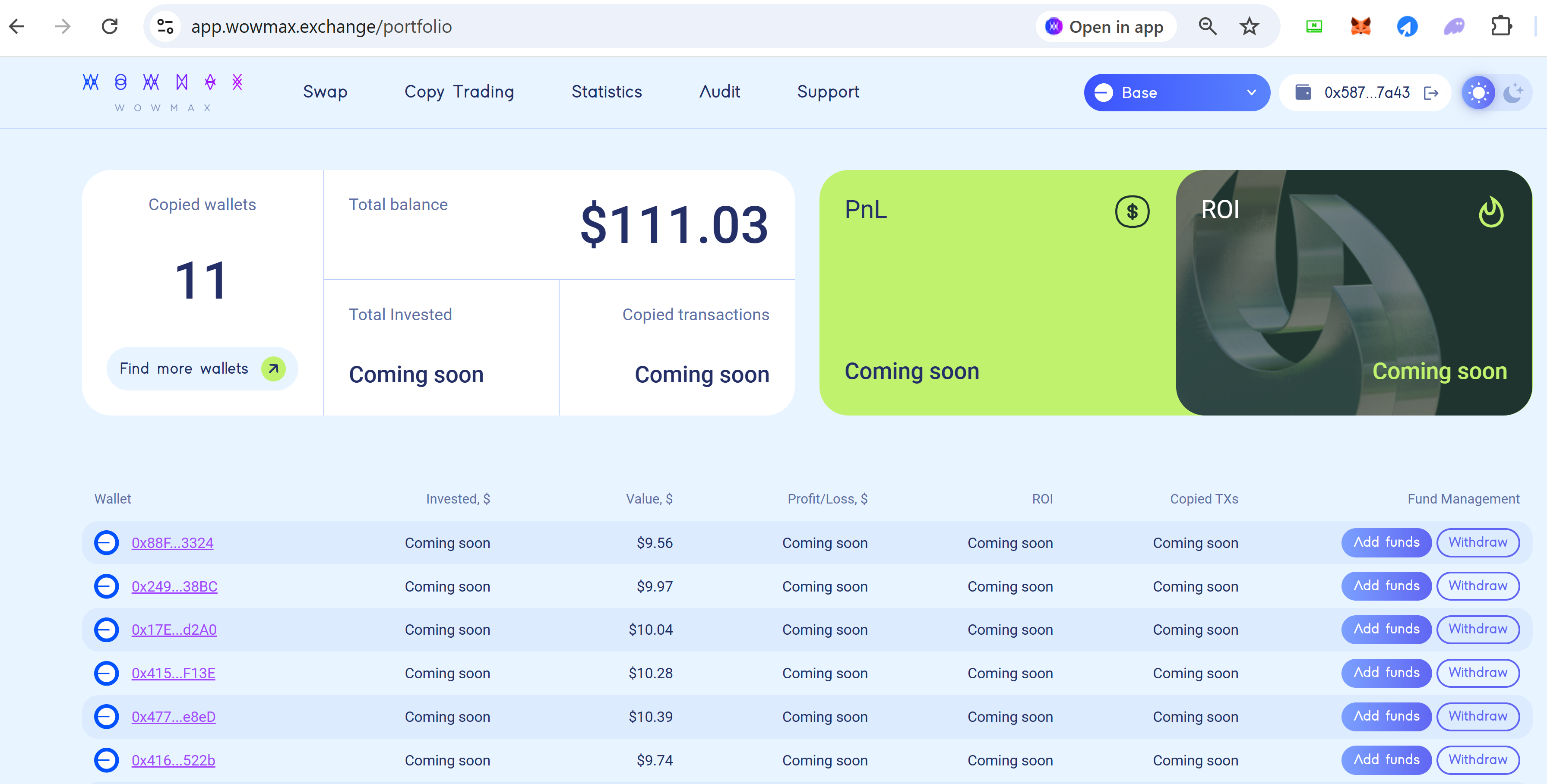 4. Portfolio page - <https://app.wowmax.exchange/portfolio> displays all wallets that you currently copy-trade.&#x20;