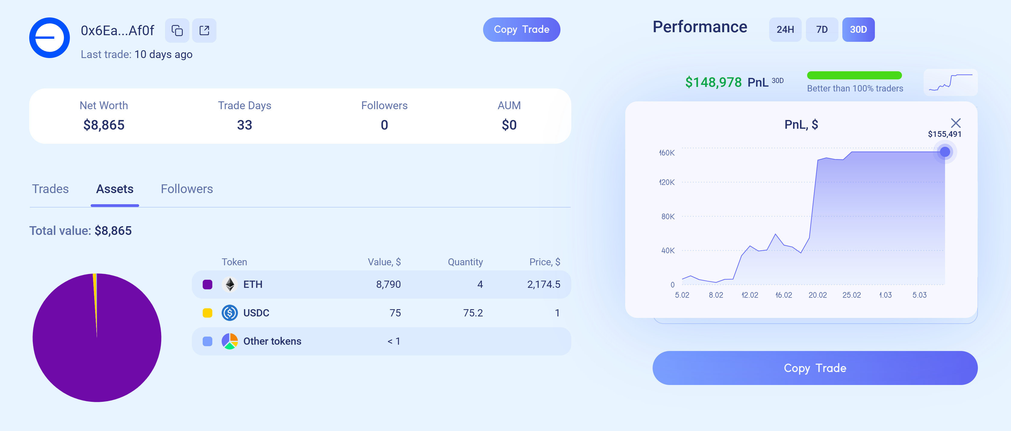 **Tip 2:** *The most profitable wallets by ROI often generated their returns from just one fortunate coin that significantly increased in value. Such wallets may still hold only that single asset. Because the smart contract initially copies the wallet’s exact portfolio, consider carefully if you want your entire deposit allocated exclusively to that token.*\