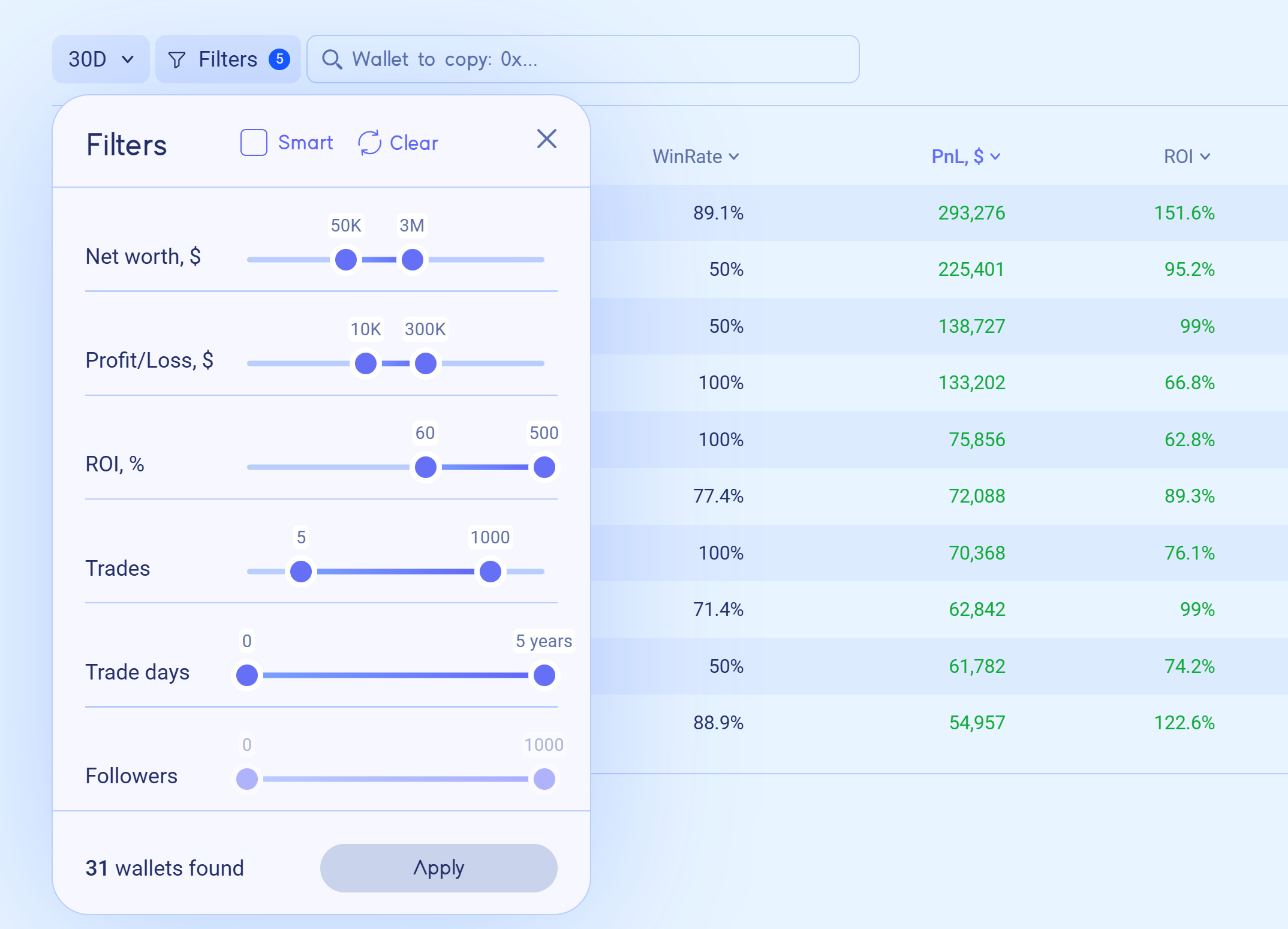 * Use a Smart filter or any other custom filter on the main page to see wallets that fit your criteria